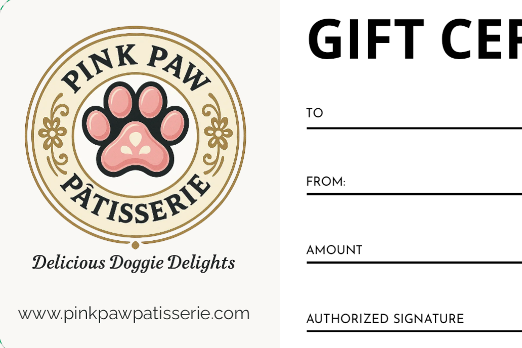 Categories: Select a Category Holidays Gift Certificate Farmer's Market Fruit Crate $10.00 Fall Artisan Cookies $5.00 BARKuterie Box $15.00 GIFT CERTIFICATE, Pink Paw Patisserie $25.00 Digital Gift Card, Pink Paw Patisserie from $25.00